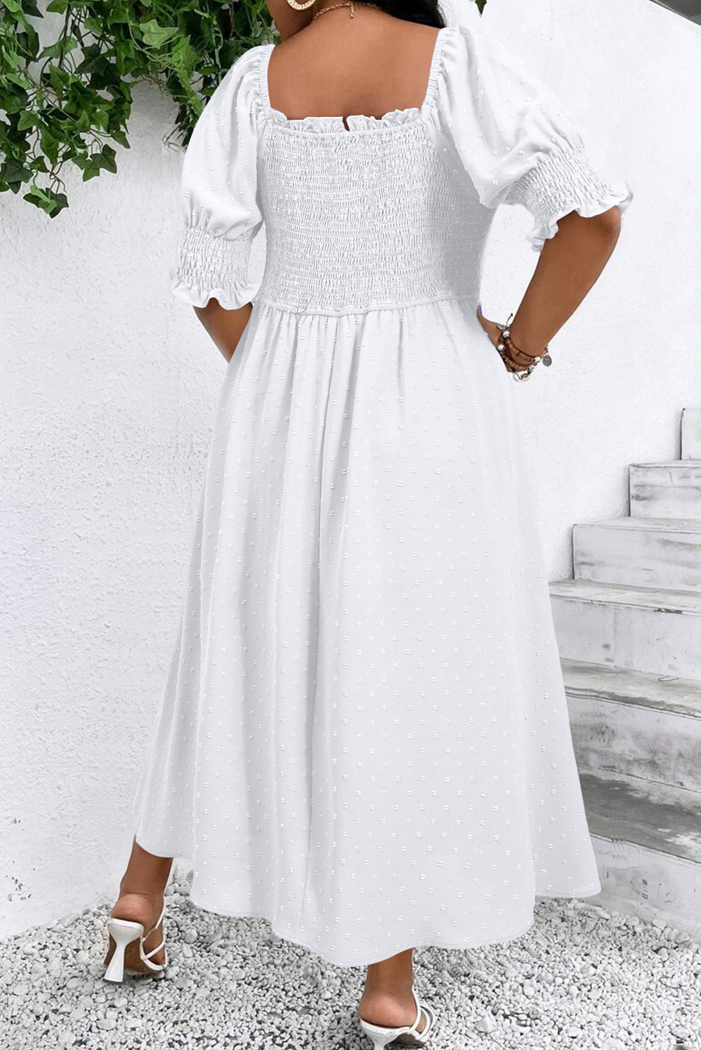 White Swiss Dot Smocked Frilled Neckline Short Sleeve Plus Size Dress